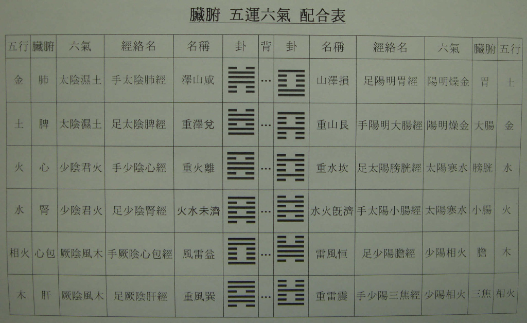 또한 이를 아래 장부 오운육기 배합표를 통해 다시 보면 임상 치료에 많은 힌트를 얻을 수 있습니다. 아래 배합표는 교상합을 나타냅니다. 즉 육기와 오행을 하나의 주역괘상으로 놓고 볼때 서로 반대되는 관계에 있지요. 즉 수태음폐 ↔ 족양명위, 족태음비 ↔ 수양명대장, 수소음심 ↔ 족태양방광, 족소음신 ↔ 수태양소장, 수궐음심포 ↔ 족소양담, 수소양삼조 ↔ 족궐음간이 그것입니다.